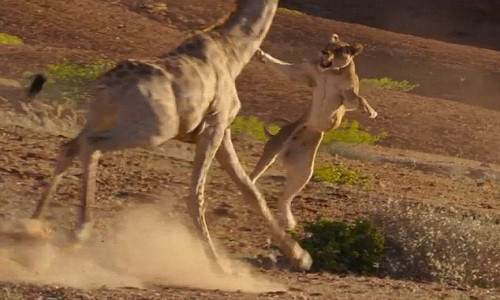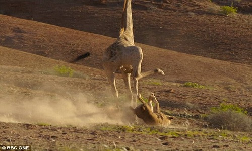 Con sư tử cái bật cao cố bám chặt cổ hươu và ghì con mồi xuống đất, nhưng hươu cao cổ chỉ đơn giản hất kẻ tấn công xuống đất, không quên vung chân dẫm mạnh lên mình con thú săn mồi trước khi sải bước lao đi.