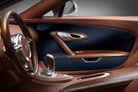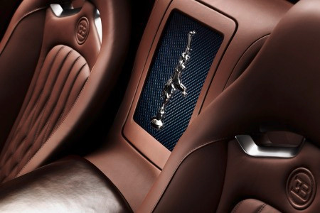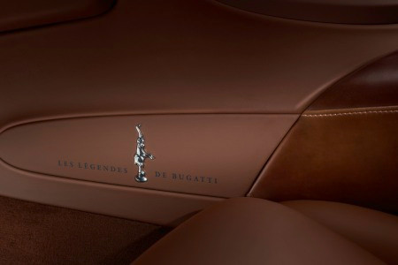 Bên trong xe xuấthiện 2 loại da lần đầu tiên được sử dụng. đầu tiên là da bê truyền thống màunâu tự nhiên (Brun Cavalier) để bọc phần lớn khoang lái kết hợp với da cordovantự nhiên dành cho những chi tiết được chế tạo thủ công bằng tay. Chất liệu sợicarbon tiếp xúc bên ngoài tại trong cabin được sơn màu xanh thẫm tương tự ngoạithất xuất hiện trên ốp cửa và hộp chứa đồ trung tâm ở phía sau, trong khi biểutượng chú voi nhảy múa được mạ bằng bạch kim gợi liên tưởng đến việc trang tríbên trong Bugatti Type 41 Royale.