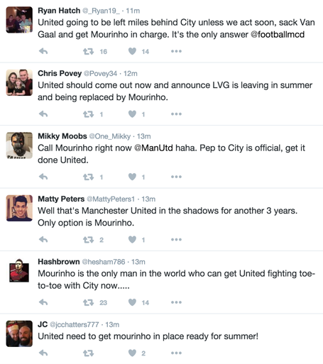 Như đã biết, Man City vừa đánh bại MU, Chelsea để giành chữ ký của HLV Pep Guardiola. Ngay sau khi Man “xanh” công bố thông tin trên, tâm trạng của CĐV Quỷ đỏ rất thất vọng. Ngay lập tức, nhiều fan MU đã lên tiếng cầu cứu HLV Mourinho về dẫn dắt đội bóng thay thế Van Gaal.