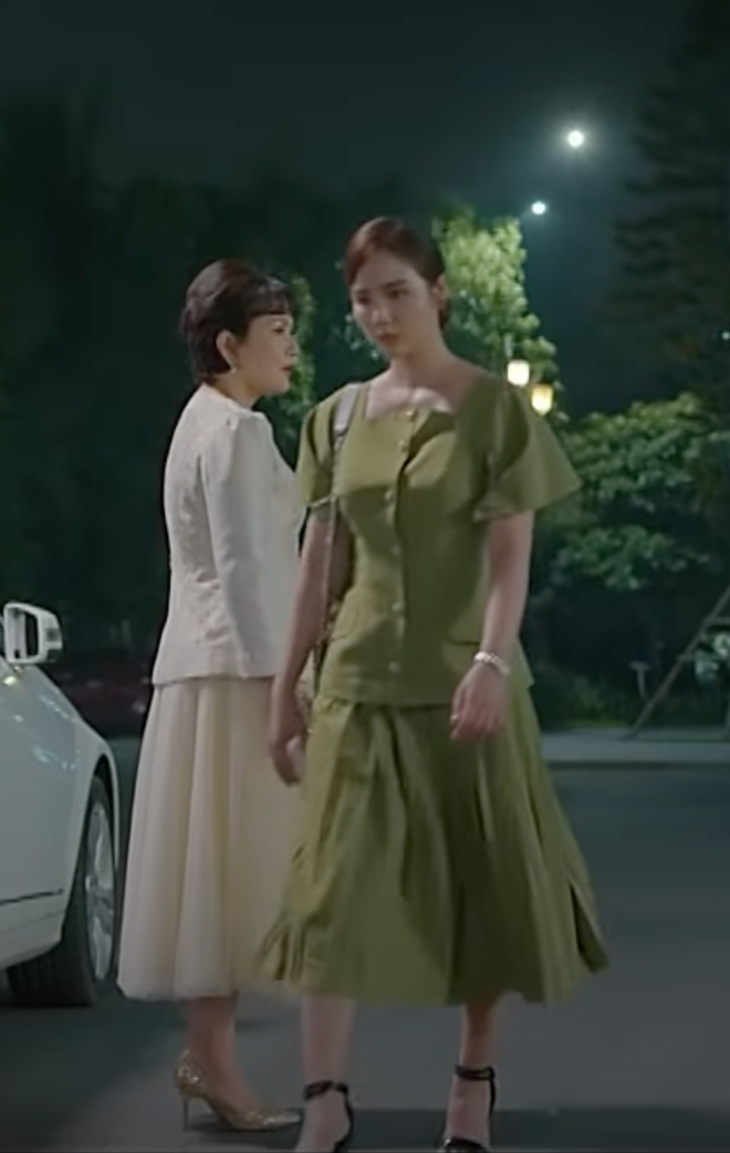 Trong cảnh này, Huyền Lizzie chọn một bộ váy xanh cốm dịu dàng gồm áo vest cổ vuông cách điệu và chân váy xếp li. Hình ảnh Huyền Lizzie bước đi dưới mưa trong bộ váy thướt tha chắc chắn sẽ khiến nhiều khán giả cảm động khi phân đoạn này lên sóng.