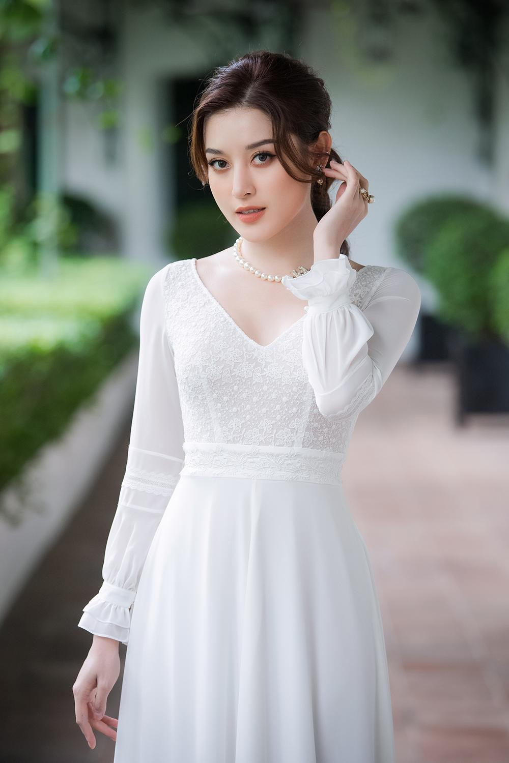| Trái ngược với vẻ sexy của Huyền My, Á hậu Tú Anh lại kín đáo với bộ váy ren trắng. |
