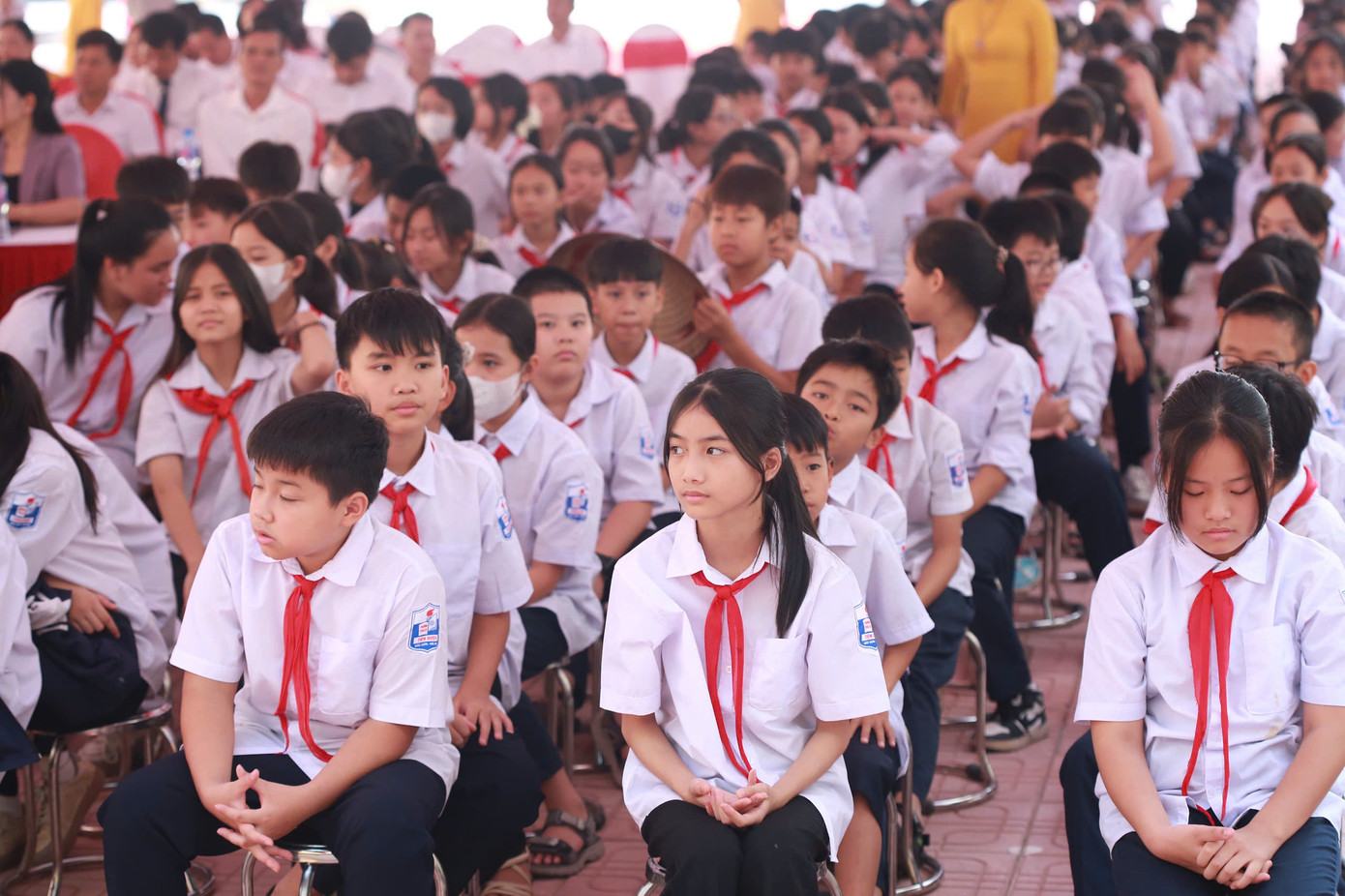 | Đại biểu chụp ảnh lưu niệm tại trường THCS Mai Đình - Tiên Dược. |