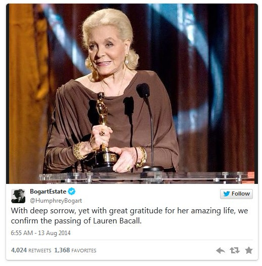 Thông tin về sự ra đi của Lauren Bacall được MSNBC thông báo đầu tiên trên Twitter và sau đó được xác nhận trên trang blog chính thức của Humphrey Bogart - chồng cũ và cũng là một huyền thoại điện ảnh khác của điện ảnh Mỹ.