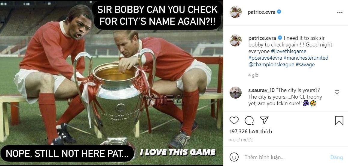 “Sir Bobby, ông có thể kiểm tra lại xem có tên của Man City có khắc trên chiếc cúp không? Không, chẳng có tên Man City nào ở đây cả Patrice Evra à", là đoạn hội thoại giả định mà Evra nghĩ ra để chế nhạo Man City. Bài đăng của Evra trên mạng xã hội đã thu hút nhiều sự chú ý của các cổ động viên M.U.