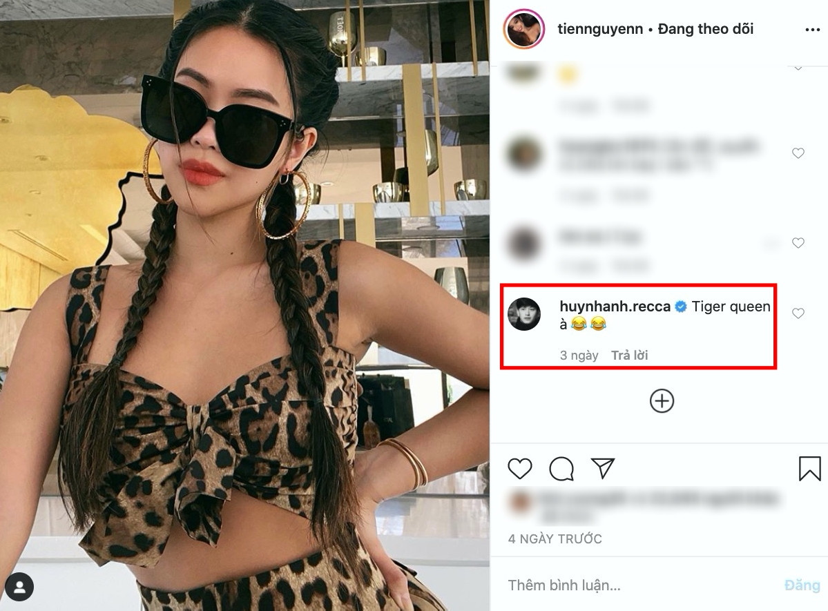 Huỳnh Anh đã bình luận ngay bên dưới bức ảnh của Tiên Nguyễn: "Tiger queen à?". Đáng chú ý, thời điểm comment cũng là ngày mà nam diễn viên úp mở chuyện hẹn hò với người mẫu Hồng Quế.