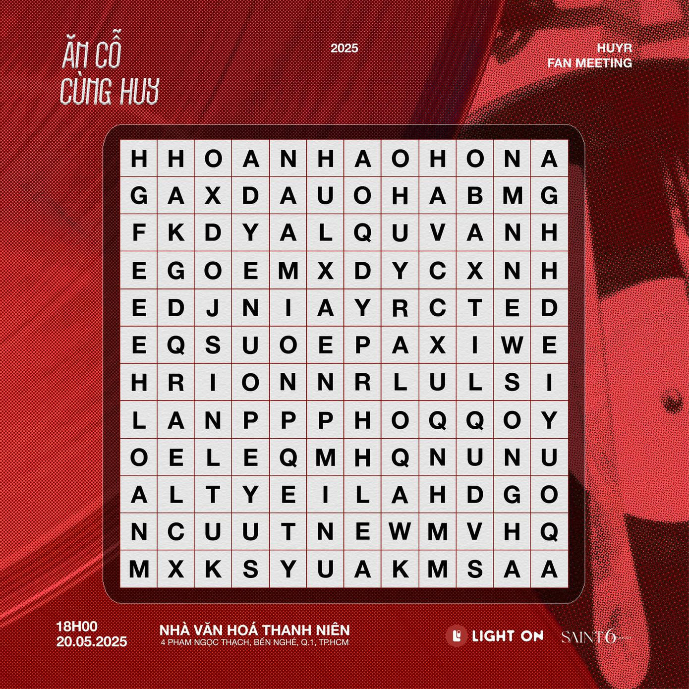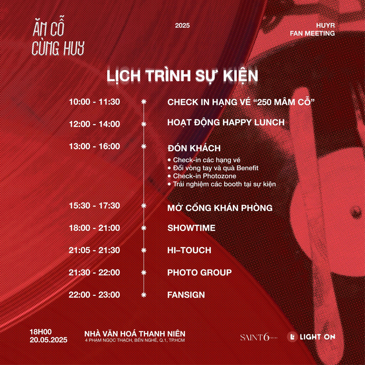 Fan meeting của HuyR mang tên Ăn cỗ cùng Huy sẽ kéo dài từ 12h-23h ngày 20/5/2025, tại Nhà văn hoá Thanh Niên (Q.1, TP.HCM), hứa hẹn là một “bữa cỗ” linh đình và nhiều quà tặng dành cho Rối Fam.