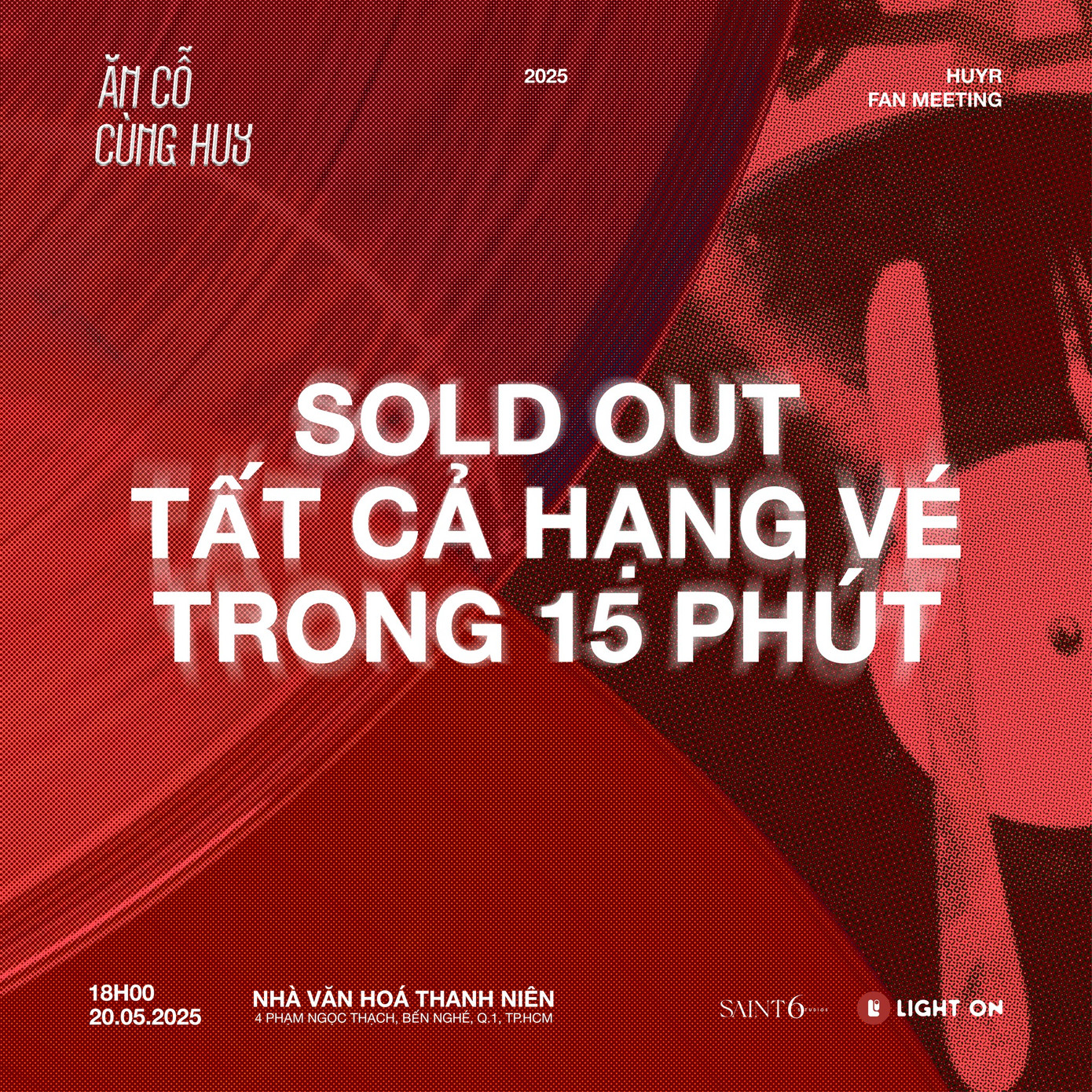 Fan meeting Ăn cỗ cùng Huy mở bán 4 hạng vé từ 500K - 2,5 triệu đồng với nhiều quyền lợi hấp dẫn, đã nhanh chóng “hết veo” các hạng vé chỉ sau 15 phút mở bán, khiến nhiều fan xuất hiện ở phút 16 chỉ biết tiếc nuối.