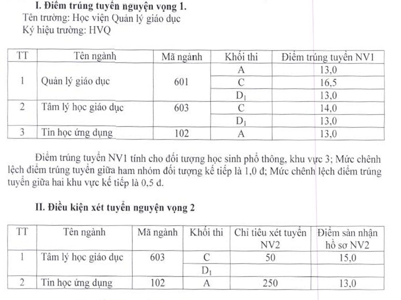 Điểm chuẩn NV1, NV2 vào Học viện Quản lý giáo dục như sau: