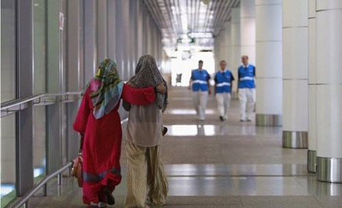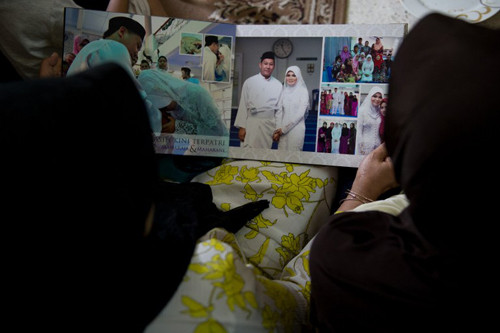 Cô Norliakmar Hamid (trùm khăn trắng) và chồng, Razahan Zamani, là hai trong số những hành khách trên chiếc máy bay đang bặt vô âm tín