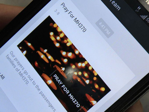 Thông điệp "Cầu nguyện cho MH370" của một ứng dụng OTT trên điện thoại ở Kuala Lumpur. Lực lượng cứu hộ hàng hải Việt Nam cho hay đã phát hiện hai vết dầu loang kéo dài 15-20 km trong vùng biển gần đảo Thổ Chu và mũi Cà Mau. Việt Nam có thể tiếp cận hiện trường lúc 22-23h đêm nay để xác định liệu đây có phải là dấu vết của máy bay Malaysia mất tích hay không.