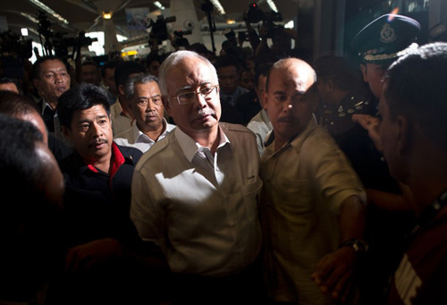 Thủ tướng Malaysia Najib Razak (giữa) đến trung tâm đón tiếp tại sân bay quốc tế Kuala Lumpur để thăm hỏi gia đình các hành khách mất tích.