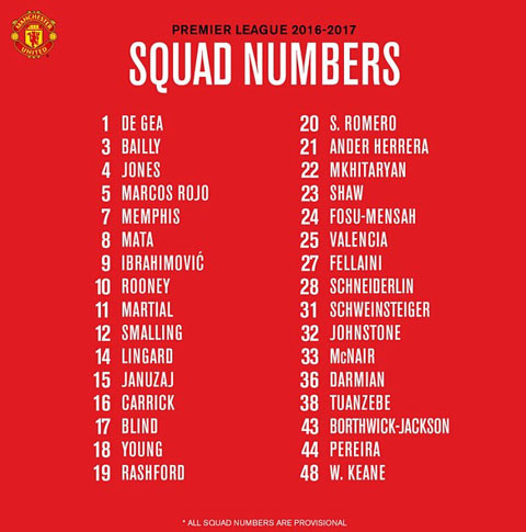 Bên cạnh đó, các tân binh Eric Bailly và Henrikh Mkhitaryan lần lượt được trao chiếc áo số 3 và số 22. Một điểm đáng chú ý khác, chiếc áo số 6 của M.U vẫn còn trống, nhiều khả năng là để dành cho Paul Pogba. Một số áo khác vẫn để trống là số 2.
