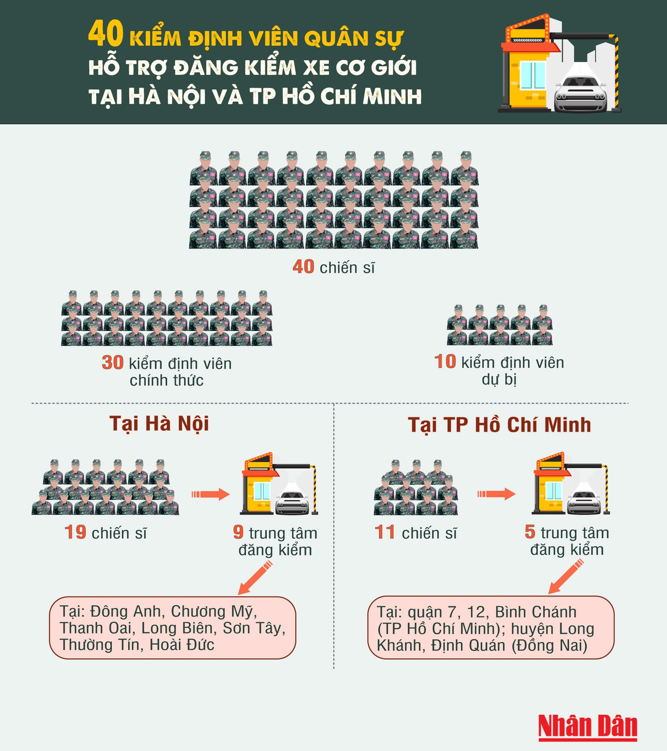 Cục Đăng kiểm Việt Nam đã chính thức tiếp nhận 40 kiểm định viên quân sự vào chiều 18/3 để hỗ trợ kiểm định xe cơ giới dân sự theo chỉ đạo của Chính phủ. Các đăng kiểm viên quân sự của Bộ Quốc phòng được phân công về các trung tâm đăng kiểm tại Hà Nội và Thành phố Hồ Chí Minh để nhanh chóng hỗ trợ công tác kiểm định xe cơ giới.