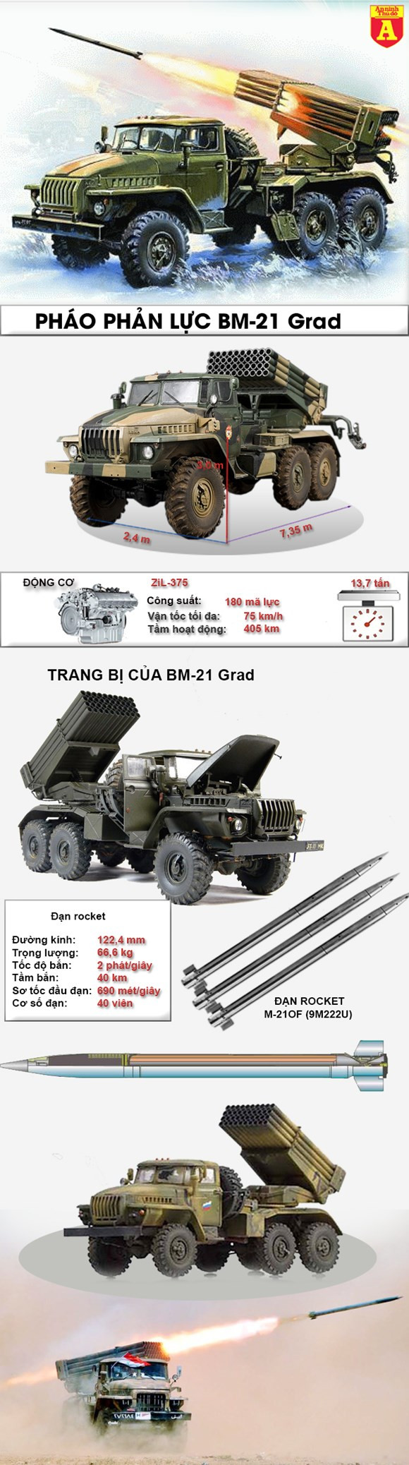 Hệ thống pháo phản lực BM-21 được coi là một trong những hệ thống pháo phản lực nguy hiểm và phổ biến nhất thế giới. Tại chiến trường Syria, BM-21 được sử dụng bởi cả 2 phía. Quân khủng bố “Nhà nước Hồi giáo” (IS) tự xưng đã thu được hệ thống pháo này từ quân đội chính phủ Syria. BM-21 được đưa vào sử dụng từ năm 1963 trong quân đội Liên Xô, và hàng chục quốc gia trên thế giới. Các ống phóng có thể phóng từng ống hoặc đồng loạt. Khẩu đội 3-4 người có thể trú trong cabin để bắn hoặc đứng từ xa và điều khiển qua đường cáp dài tới 64 m. Đạn nạp bằng tay và phải mất khoảng 10 phút để lắp hết 40 ống phóng.