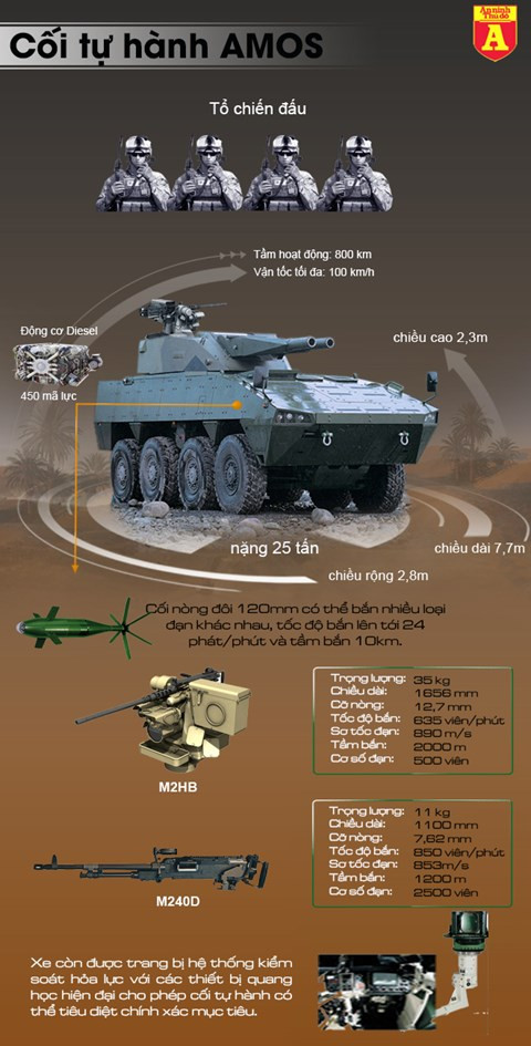 Hệ thống pháo cối tự hành tiên tiến AMOS (Advance MOrtar System) được nghiên cứu phát triển từ năm 1996 với sự hợp tác giữa hai công ty Patria và Hagglunds, Phần Lan. Đây được coi là hệ thống cối tự hành hiện đại nhất thế giới hiện nay. Điểm độc đáo của AMOS nằm ở việc nó được trang bị tháp pháo gắn hai nòng pháo cối cỡ 120 mm. Nhờ hệ thống nạp đạn hoàn toàn tự động, tốc độ bắn duy trì của AMOS lên tới 26 phát/phút. Ngoài ra hệ thống còn có chức năng MRSI (Multiple Rounds Simulteaneous Impact), nghĩa là AMOS sẽ thay đổi góc bắn của nòng pháo cực nhanh, khiến tất cả các viên đạn bay tới mục tiêu gần như cùng lúc.