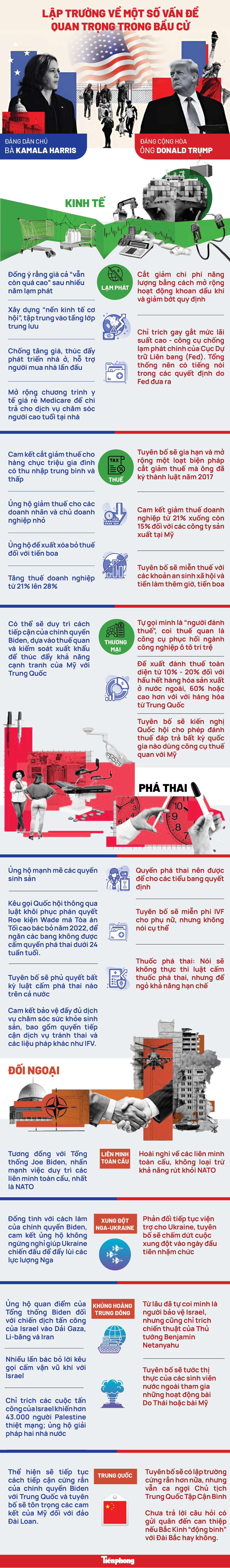 TPO - Từ phá thai đến kinh tế, ứng viên tổng thống đảng Dân chủ Kamala Harris và đối thủ Donald Trump của đảng Cộng hòa đưa ra tầm nhìn hoàn toàn khác biệt cho nước Mỹ, dù rằng việc thực hiện những quan điểm đó có thể vấp phải thách thức pháp lý hoặc trở ngại ở Quốc hội.