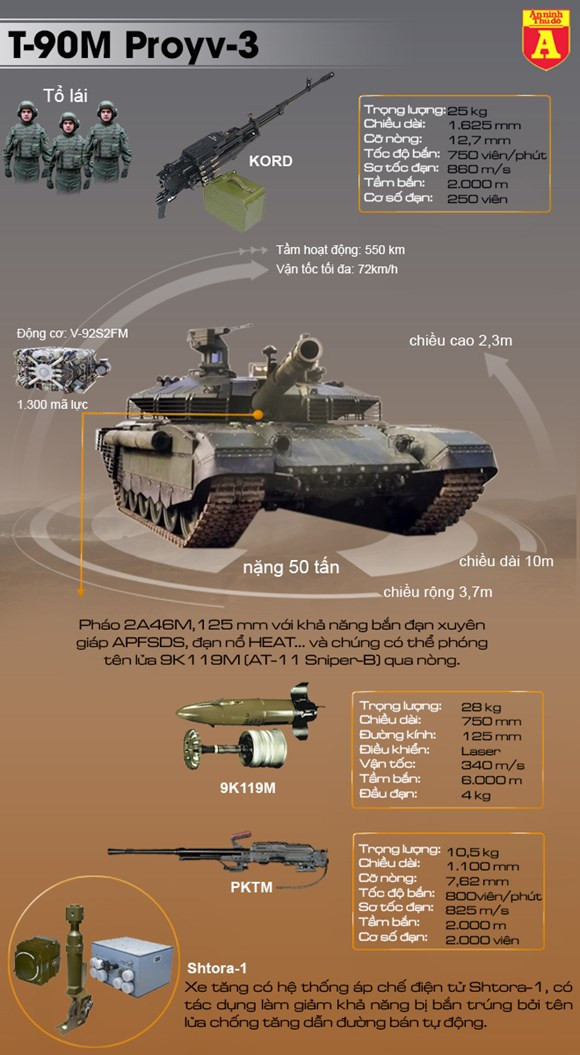 Nga vừa chính thức ra mắt siêu tăng T-90M Proryv-3. Đây là biến thể nâng cấp sâu rộng của xe tăng T-90. Xe được nâng cấp về hệ thống giáp bảo vệ, thiết bị điện tử cùng khối động cơ mạnh mẽ hoạt động ổn định. Sức mạnh của loại tăng mới được đánh giá tiệm cận với dòng xe tăng T-14 Armata.
