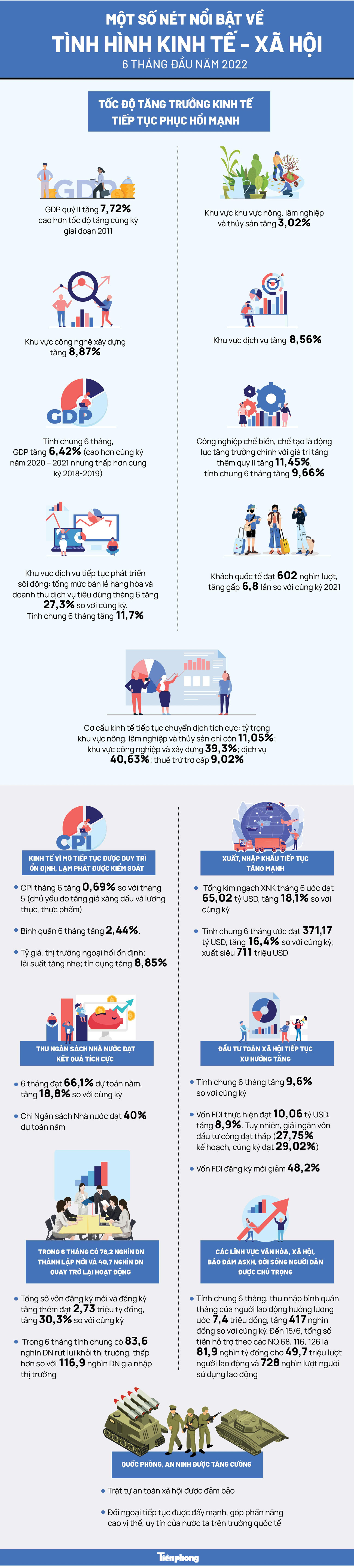 TPO - Sáu tháng đầu năm 2022, tốc độ tăng trưởng kinh tế Việt Nam tiếp tục có sự phục hồi mạnh; kinh tế vĩ mô duy trì ổn định, lạm phát được kiểm soát; các lĩnh vực văn hóa, xã hội, đời sống người dân được chú trọng; quốc phòng, an ninh được tăng cường, trật tự an toàn xã hội được đảm bảo…