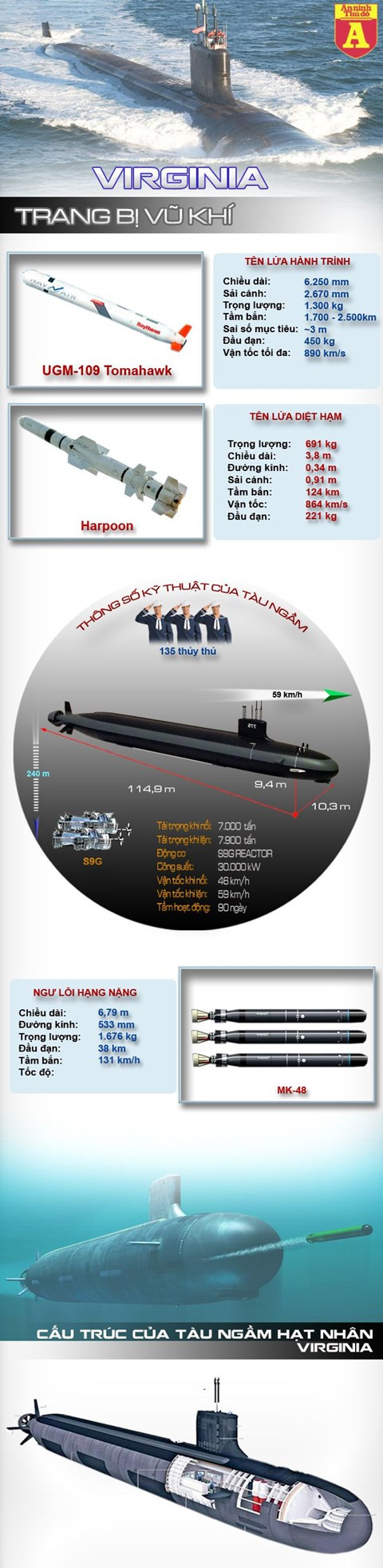 Virginia là lớp tàu ngầm hạt nhân tấn công của Hải quân Mỹ được chế tạo với giá 2 tỷ USD/chiếc trang bị hệ thống điện tử, vũ khí cực kỳ hiện đại, đây được coi là loại tàu ngầm hiện đại nhất hiện nay của Hải quân Mỹ.