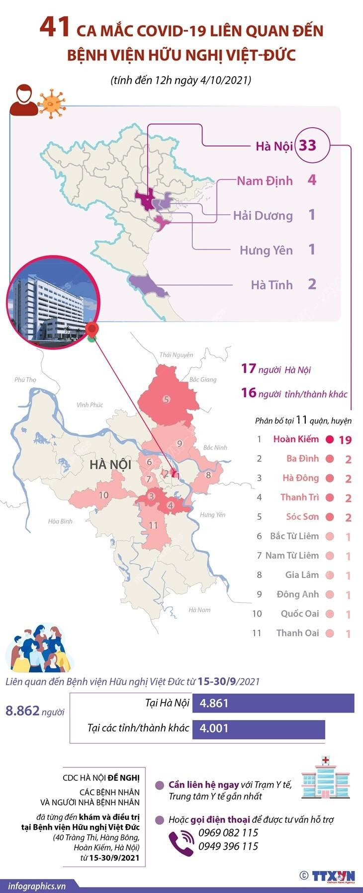 Sở Y tế Hà Nội cho biết, từ 6h đến 12h ngày 4/10, Hà Nội phát hiện thêm 2 ca mắc COVID-19 mới liên quan đến Bệnh viện Hữu nghị Việt - Đức. Như vậy, đã có 41 ca mắc COVID-19 liên quan đến bệnh viện, trong đó 33 ca tại Hà Nội, 8 ca còn lại thuộc các tỉnh, thành khác.