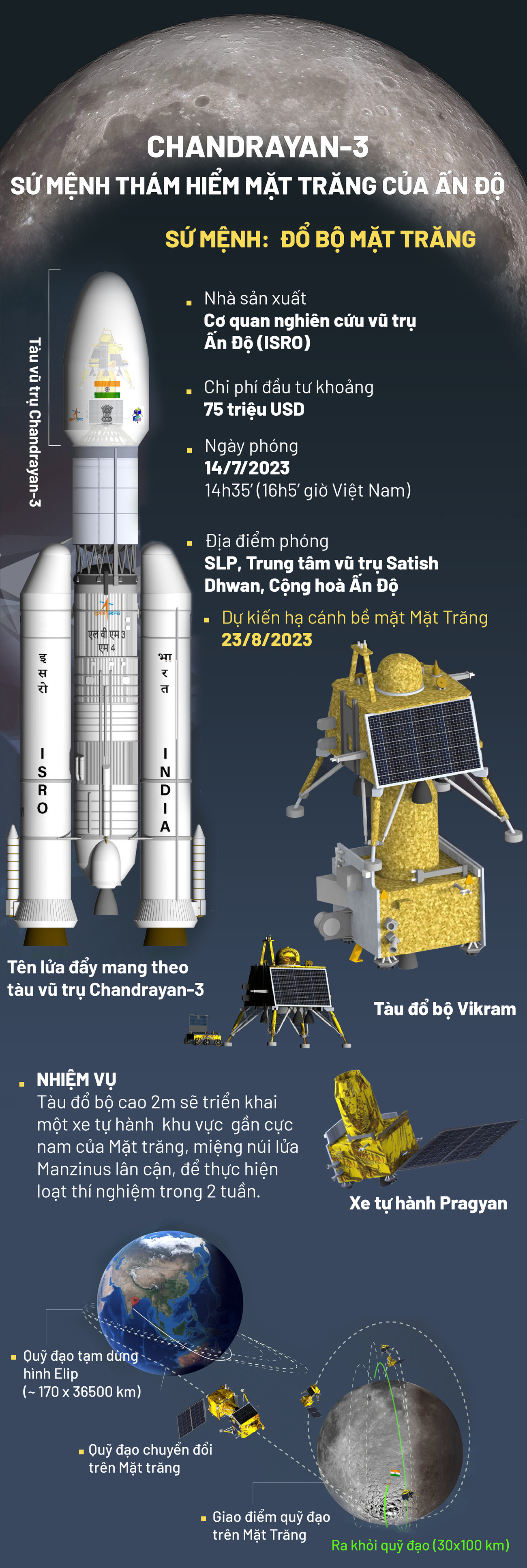 TPO - Tàu vũ trụ Chandrayan-3 đã khởi hành vào ngày 14/7 và dự kiến đổ bộ xuống Mặt Trăng vào ngày mai 23/8/2023. Ấn Độ có thể trở thành quốc gia thứ 4 trên thế giới "đặt chân" tới Mặt Trăng.
