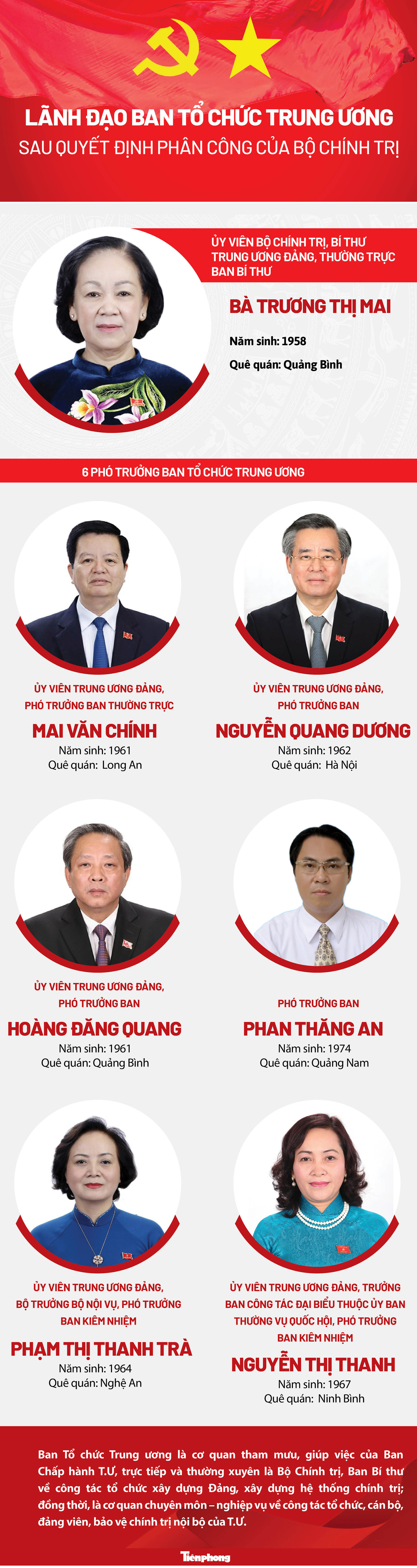 TPO - Bộ Chính trị vừa phân công bà Trương Thị Mai, Trưởng Ban Tổ chức Trung ương (T.Ư) giữ chức Thường trực Ban Bí thư, Trưởng Ban Tổ chức T.Ư. Với sự phân công trên, bộ máy lãnh đạo Ban Tổ chức T.Ư vẫn giữ nguyên, gồm 1 Trưởng ban, 6 Phó Trưởng ban (trong đó có 2 Phó Trưởng ban kiêm nhiệm).