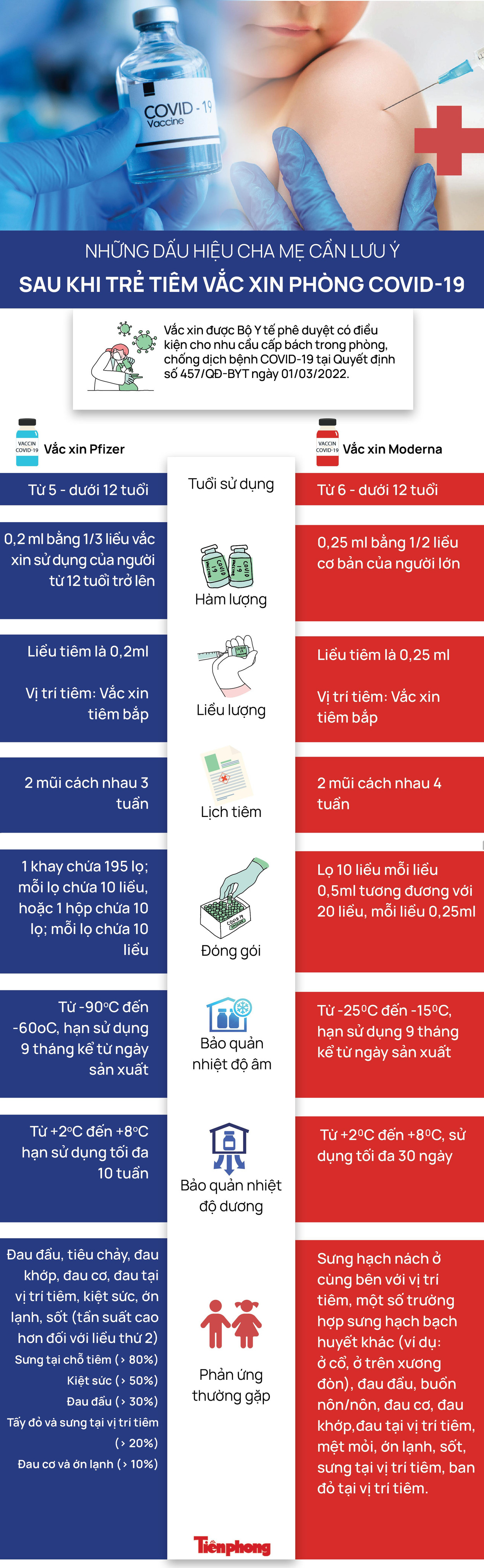 TPO - Có hai loại vắc xin phòng COVID-19 tiêm cho trẻ từ 5 đến dưới 12 tuổi là Pfizer và Moderna. Bộ Y tế yêu cầu chỉ tiêm 2 mũi duy nhất cùng loại vắc xin, không tiêm trộn với bất kì vắc xin mRNA nào.