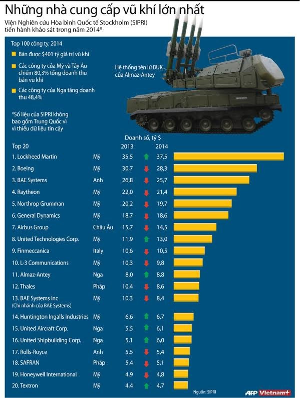 [Infographics] Những nhà cung cấp vũ khí lớn nhất thế giới