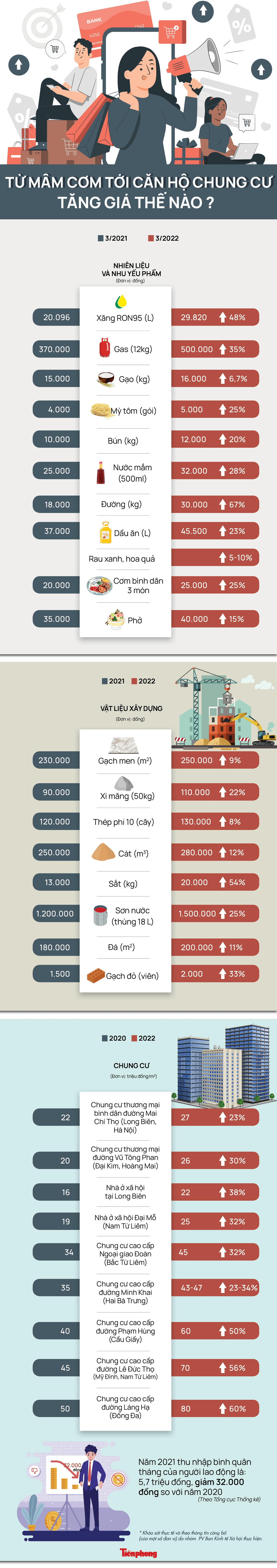 TPO - Giá xăng tăng gần gấp đôi chỉ sau hơn 1 năm, hiện tiệm cận 30.000 đồng/lít, đẩy giá hầu hết hàng hoá cơ bản tăng cao. Trong khi đó, thu nhập bình quân của người lao động sụt giảm, khó khăn cân đối chi tiêu. Ước mơ “nhà Hà Nội” của nhiều người càng thêm xa vời, chung cư ở quận ngoại thành cũng lên giá vù vù, vật liệu xây dựng leo thang đắt đỏ.
