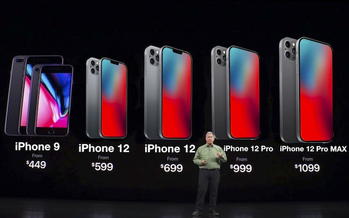 Theo đó, iPhone 12 (5.4-inch) được cho là sẽ có giá khởi điểm 699 USD; iPhone 12 Plus (6.1-inch) sẽ có giá khởi điểm 799 USD; iPhone 12 Pro (6.1-inch) sẽ có giá khởi điểm 1.049 USD hoặc 1.099 USD; và iPhone 12 Pro Max (6.7-inch) sẽ có giá khởi điểm 1.149 USD hoặc 1.199 USD.