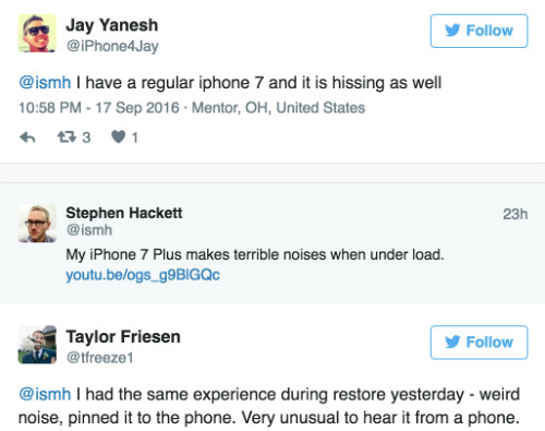 Stephen Hackett, blogger công nghệ của trang 512 Pixels, được cho là người đầu tiên phát hiện ra tiếng rít lạ trên iPhone 7 Plus đã liên hệ với Apple. Tuy nhiên, Hackett chỉ được nhân viên của Apple trả lời sẽ đổi cho máy mới thay vì giải thích chi tiết tại sao có âm thanh lạ như vậy.