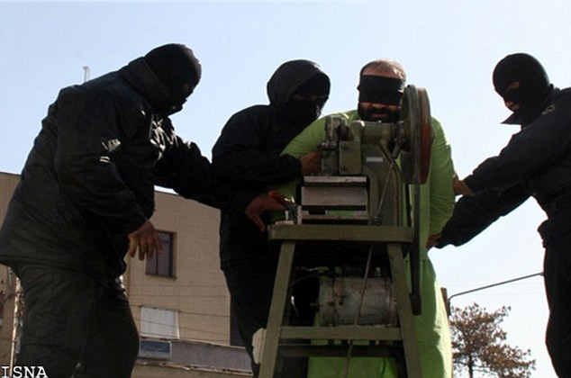 Trong những bức ảnh do một cơ quan tin tức nhà nước Iran đăng tải, một tội phạm bị bịt mắt, do hai người đàn ông trùm kín mặt áp tải đến chiếc máy cưa tay.