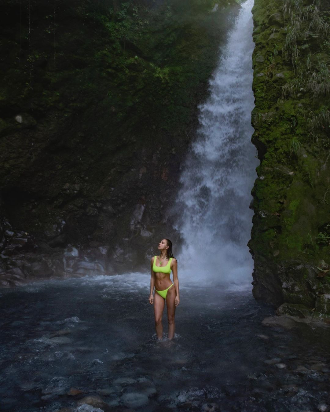 Irina Shayk diện bikini màu xanh neon giữa thiên nhiên núi rừng ở Costa Rica.