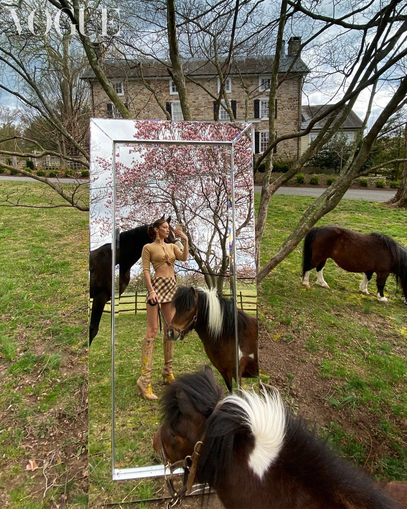 Bella Hadid: “Đôi bốt Miu Miu này rất có ý nghĩa với tôi. Tôi đã đi nó trong chiến dịch quảng cáo xuân hè 2020 của hãng." Nàng mẫu chụp bức ảnh này ngay tại nông trại gia đình ở Pennsylvania trong thời gian tự cách ly tránh dịch.