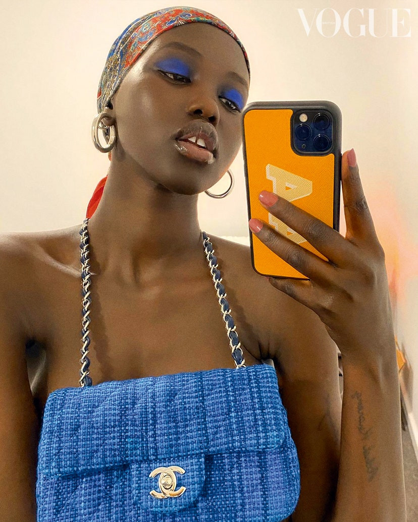 Người mẫu da màu Adut Akech che ngực với túi Chanel