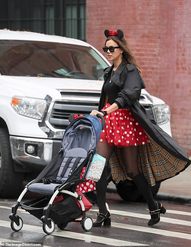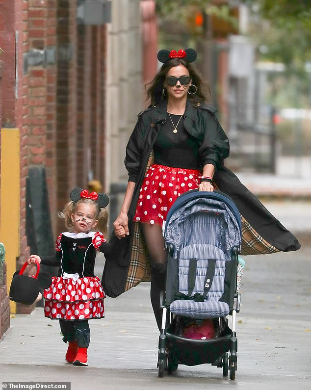 Siêu mẫu xứ bạch dương mặc áo khoác Burberry sành điệu, váy đỏ chấm bi, đeo bờm tai chuột, ton sur ton với con gái nhỏ. Hai mẹ con hóa trang thành chuột Minnie đi chơi Halloween.