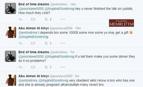 Theo RT, các chuyên gia của Viện Nghiên cứu Truyền thông Trung Đông MEMRI đã nghiên cứu nhiều đoạn hội thoại giữa chiến binh IS và những người ủng hộ nhóm này trên mạng. Họ phát hiện những kẻ này từng đề cập đến giá và cách xử lý nô lệ.