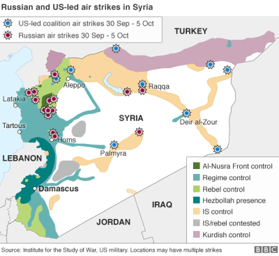 Nga bắt đầu chiến dịch không kích tại Syria từ ngày 30/9 theo đề nghị từ Tổng thống Syria Bashar al-Assad. Moscow tuyên bố nhằm vào IS nhưng Washington cùng đồng minh lo ngại Nga can thiệp quân sự để củng cố chính quyền al-Assad.