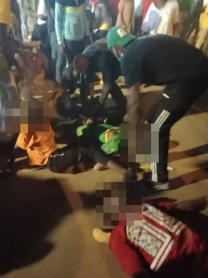 Khung cảnh tại hiện trường cho thấy nhiều người nằm bất động trước sân vận động, trong đó có cả trẻ em. Một số người may mắn khỏe mạnh đang cố gắng hô hấp nhân tạo cho các nạn nhân. Giày, mũ lưỡi trai và những bộ tóc giả sặc sỡ ngổn ngang trên mặt đất. Các bệnh viện xung quanh sân vận động đều không thể chữa trị và những người chuyển nặng sẽ phải chờ để được đưa đến một bệnh viện khác.