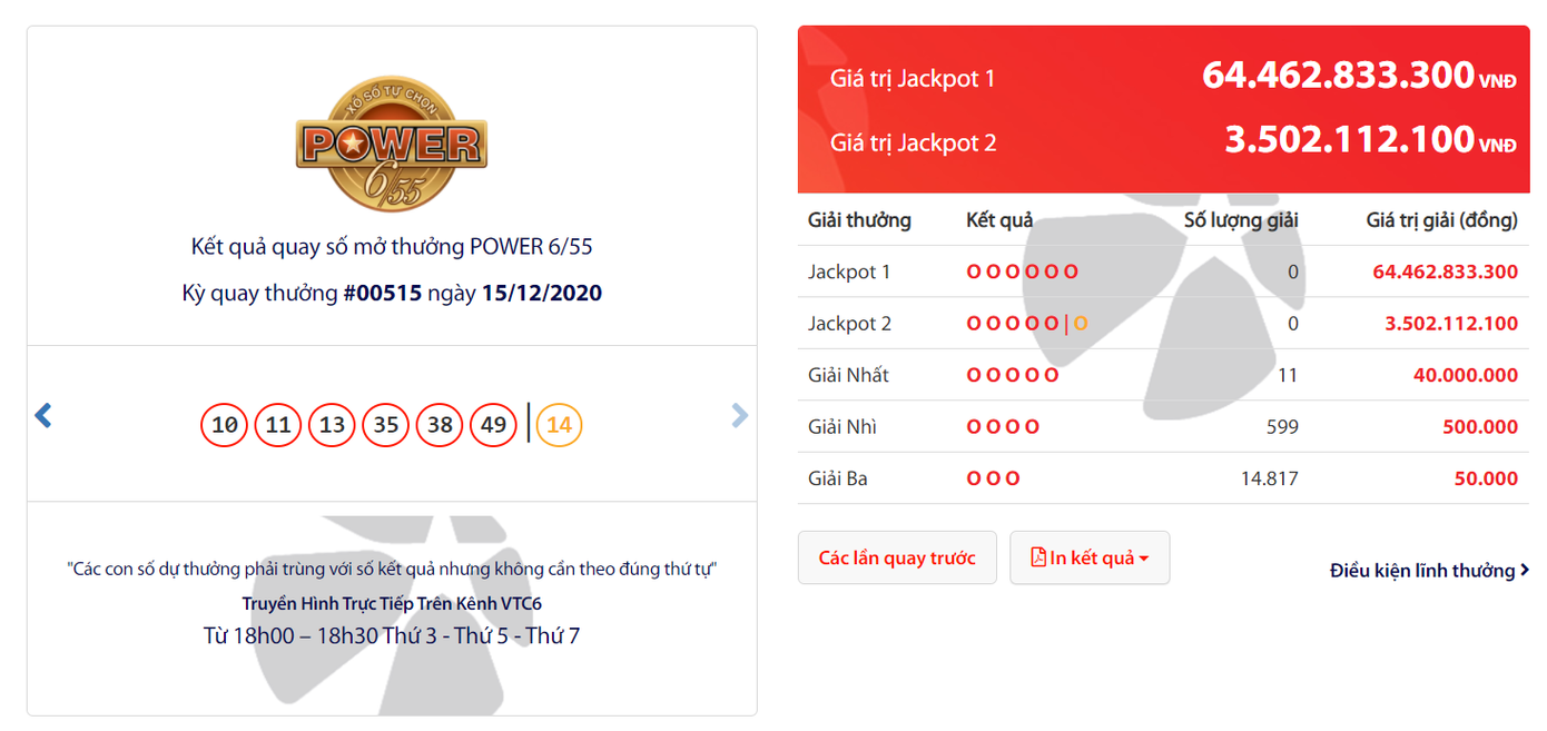 Xổ số tự chọn Power 6/55 của Vietlott sẽ tiếp tục đi tìm “tỷ phú Vietlott” cuối cùng của năm 2020 với kỳ quay tối ngày 17/12. Dự kiến sau kỳ quay, Jackpot 1 của sản phẩm này sẽ tích lũy lên mức khoảng 67 tỷ đồng cùng Jackpot 2 khoảng hơn 4 tỷ đồng.