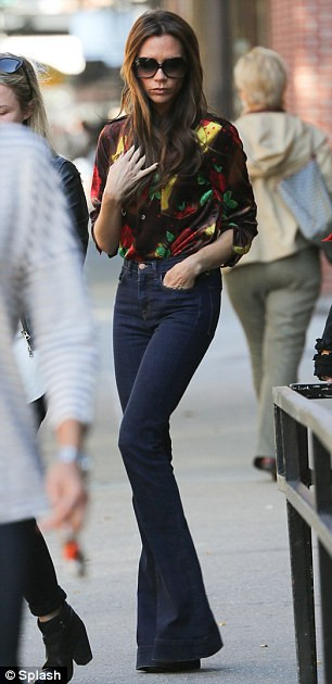 Bà Beck tiên phong với "cơn lốc" quần ống loe đang bắt đầu trỗi dậy, dáng quần ôm đùi loe phần ống sẽ khiến đôi chân bạn gái dài hơn và che được nhiều khuyết điểm như chân nhỏ quá, vòng kiềng hay hơi quá khổ.