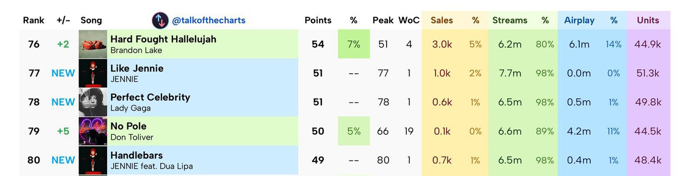 Theo dự đoán của các chuyên trang, like JENNIE và Handlebars có thể sẽ đạt hạng 76 và 80 trên Billboard Hot 100. ExtraL cũng được đoán đứng ở hạng 97. Thứ hạng có thể khiêm tốn nhưng với 3 ca khúc cùng lúc lọt vào bảng xếp hạng "khó ăn" này, đây cũng là thành tích đáng nể trong sự nghiệp cá nhân của Jennie.