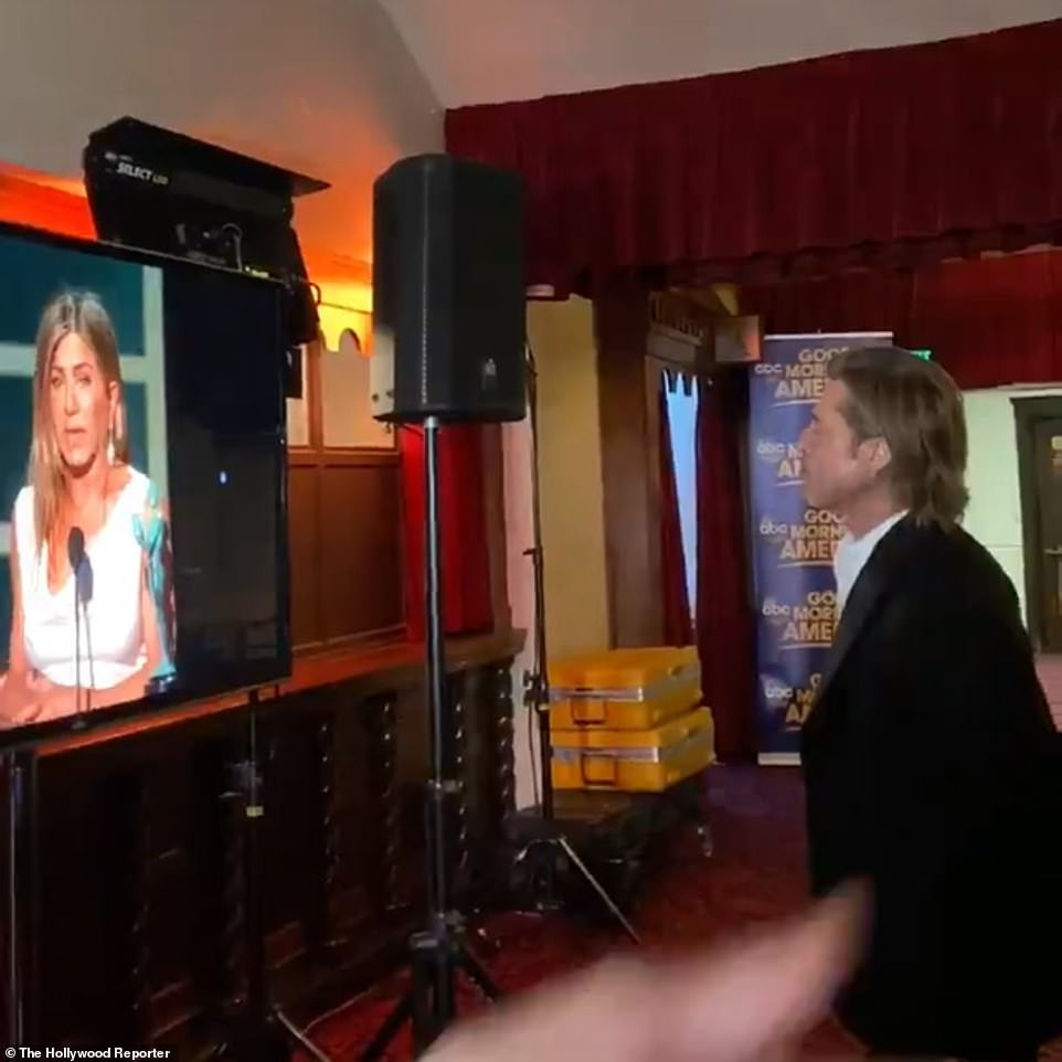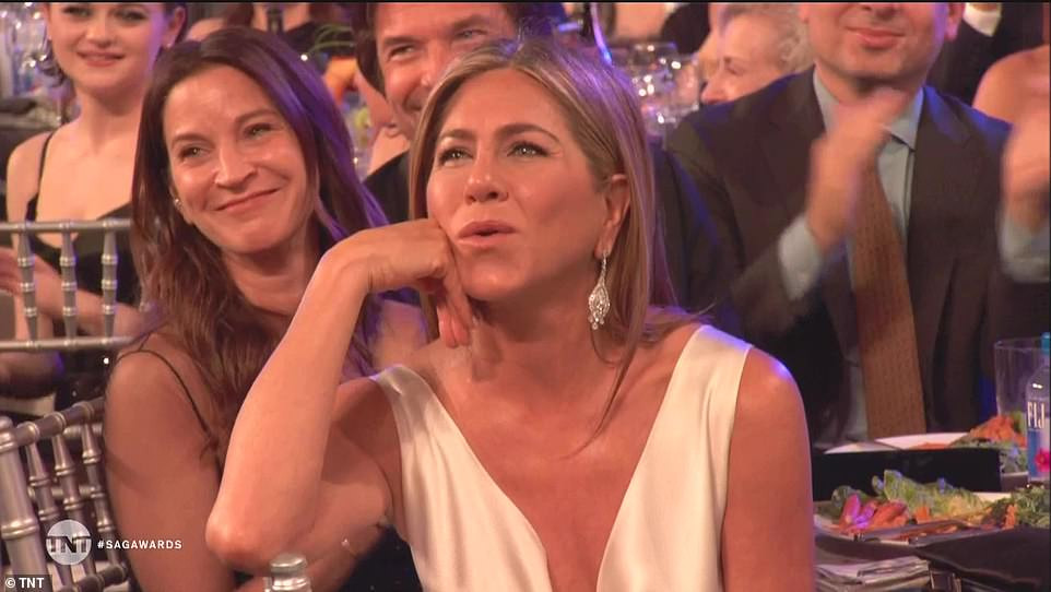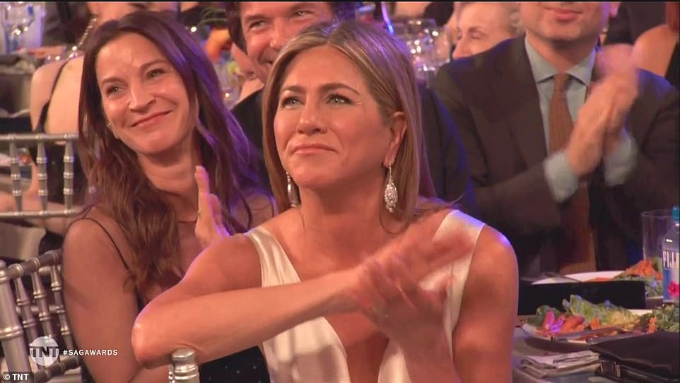Jennifer Aniston ngồi dưới chăm chú lắng nghe chồng cũ phát biểu lúc nhận giải.