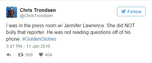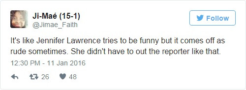 “Jennifer Lawrence đang cố gắng nói theo cách hài hước nhưng lại trở nên thô lỗ. Cô ấy không nên cư xử với phóng viên như thế”.