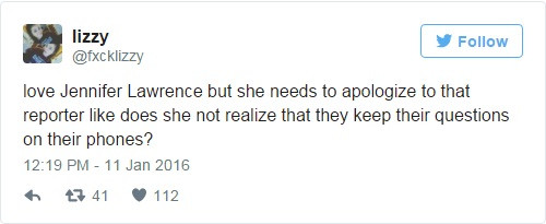 “Yêu Jennifer Lawrence nhưng cô ấy cần xin lỗi phóng viên kia. Cô ấy không biết việc họ viết các câu hỏi trong điện thoại sao?”.