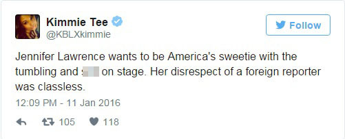 “Jennifer Lawrence muốn trở thành người Mỹ thân thiện với thái độ tồi tệ đó trên sân khấu. Thái độ thiếu tôn trọng phóng viên nước ngoài của cô ấy là vô văn hóa”.