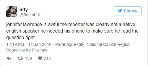 “Jennifer Lawrence thật tồi tệ, phóng viên đó rõ ràng không phải người bản xứ, anh ta cần điện thoại để đảm bảo đọc đúng các câu hỏi”.