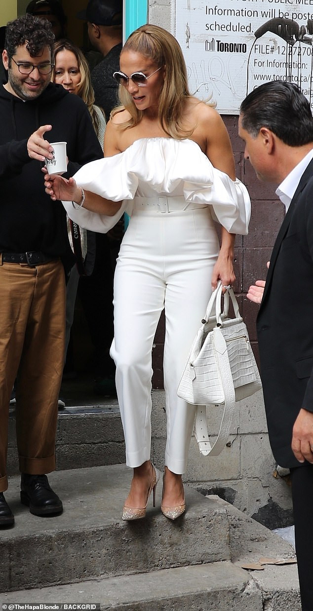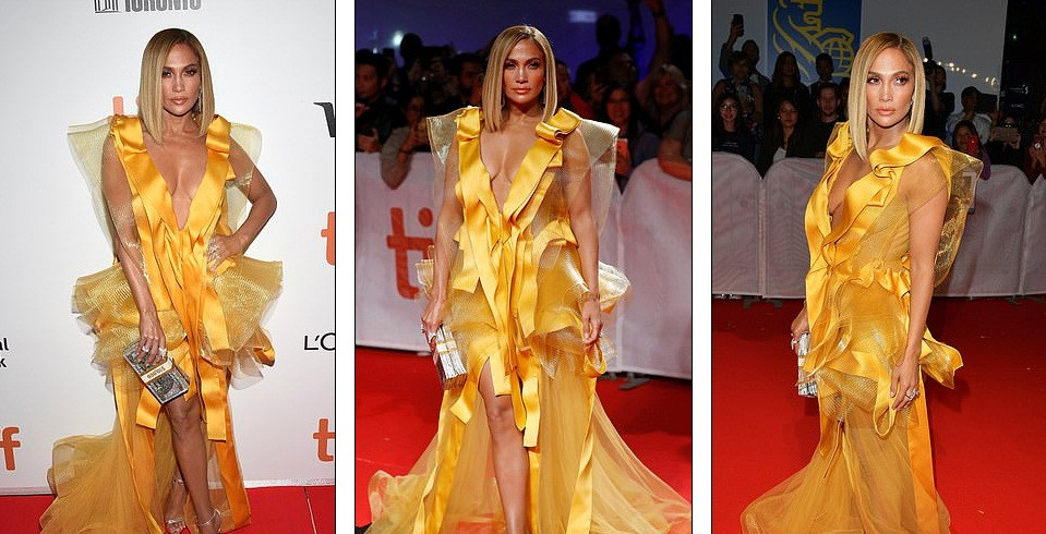 Đêm trước đó, Jennifer Lopez diện đầm vàng óng của thương hiệu Maison Yeya trên thảm đỏ LHP quốc tế Toronto.