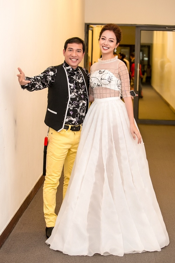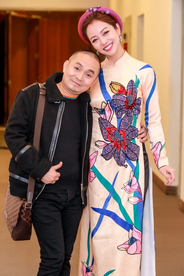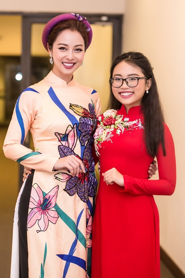 Trước đó, Jennifer Phạm diện áo dài của nhà thiết kế Thủy Nguyễn và gặp gỡ giọng ca nhí Phương Mỹ Chi trong hậu trường.