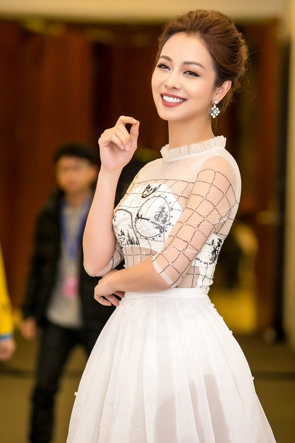 Jennifer Phạm diện đầm của nhà thiết kế Xuân Lê khi dẫn chương trình "Xuân phát tài 8" tại thủ đô. Chất liệu voan xuyên thấu với kiểu dáng bra-top bên trong tôn dáng của người đẹp.